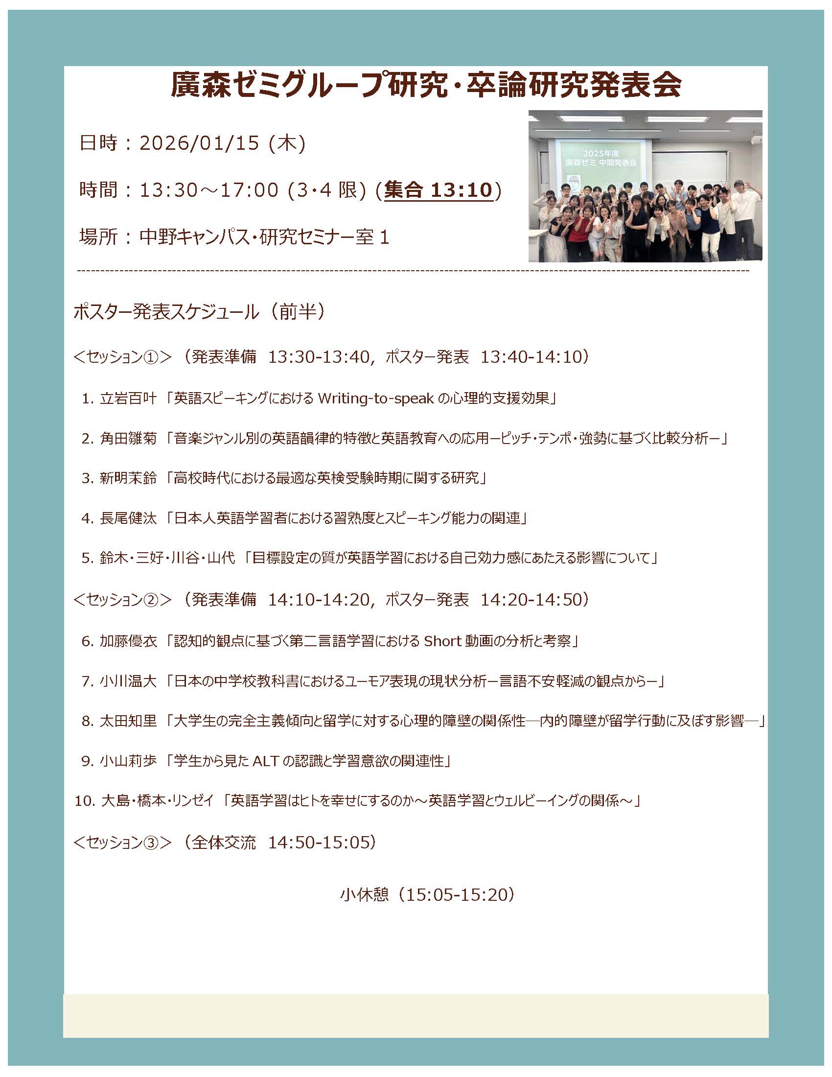 とくに4年生は卒論発表ということで,皆さん,それぞれに思い入れもあったことでしょう。これで4年ゼミもおしまいと思うと寂しいものですが,この経験や時間はきっと,これから先の人生のさまざまな場面で,皆さんを(そして,私を)支えてくれるはずです。